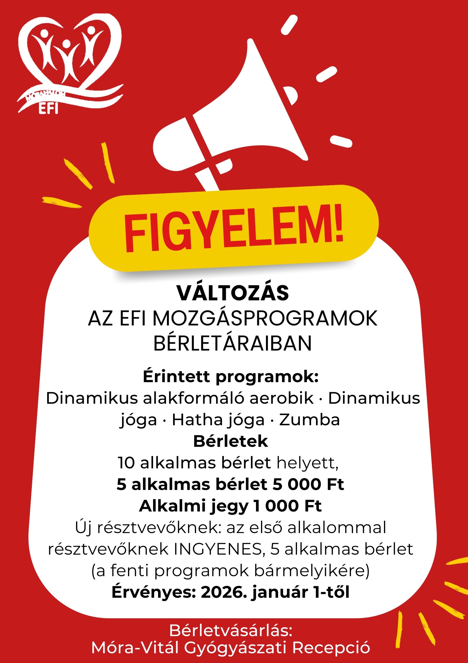 2026. január 1-jétől módosulnak az EFI rendszeres mozgásprogramjainak bérlet- és jegyárai.